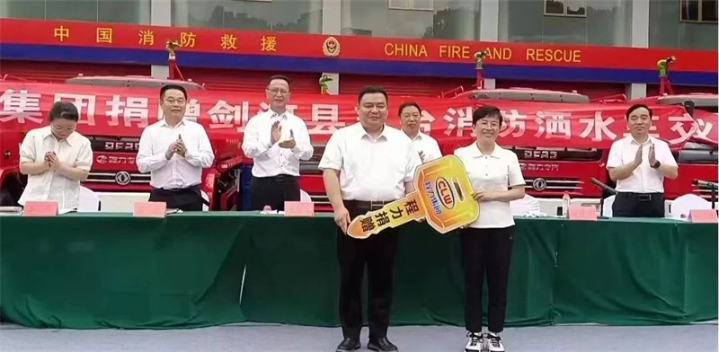 上圖:程力汽車集團董事長程阿羅(前排左)向劍河縣副縣長王平(前排右)舉行象征“致富之匙”的車輛捐贈儀式。 讓我們把時光的鏡頭聚焦在2024年11月23日,全國工商聯執委、程力汽車集團股份有限公司董事長程阿羅與集團黨委書記袁昌才等相關部門負責人,第二次到劍河縣捐贈消防灑水車;程董事長與劍河縣委書記楊勝朝、縣長陳林同志等職能部門領導,在劍河消防隊舉行了“踐行萬企興萬村,程力劍河一家親”第二批消防灑水車捐贈儀式。 上圖:從左至右分別是劍河縣縣長陳林、程力汽車集團董事長程阿羅、劍河縣委書記楊勝朝、程力汽車集團黨委書記袁昌才。