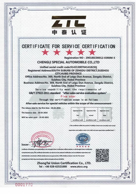 近日,程力汽車集團股份有限公司全面加強產品質量和售后服務管理工作,為企業(yè)高質增長提供可靠保障,集團公司旗下核心企業(yè)----程力專用汽車股份有限公司,經過申報、考核、驗廠,專家調研評審等嚴格評審程序,取得了國家級五星服務認證認可。 該認證是對程力公司產品質量和售后服務的全面達標的認可,也是產品占領和擴大市場份額的通行證和利器,五星級認證的獲得對產品在招投標中將起到積極的作用,是必不可少的加分事項,程力專汽也必將由此獲得更大更好的發(fā)展。 獲得五星級售后服務認證的證書如下: ![]() ![]() |