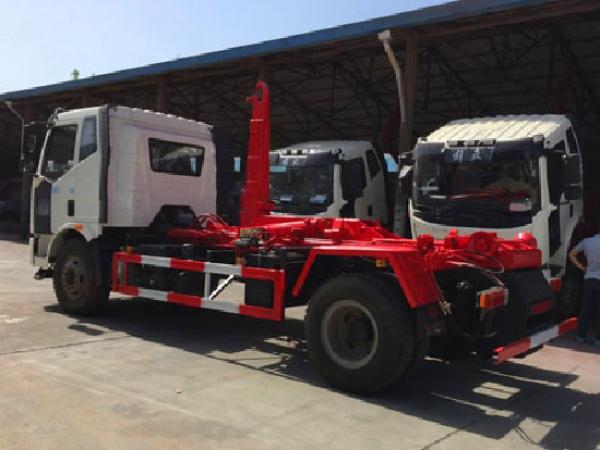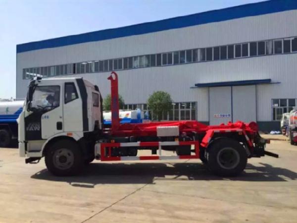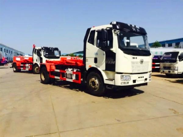 國六解放J6勾臂垃圾車(車廂可卸式垃圾車)底盤配置:采用一汽解放J6底盤,底盤型號為:CA1180P62K1L2A1E6Z,軸距4500,發動機配備大柴CA4DK1-22E6型國六柴油發動機,功率165kw,220匹馬力,8檔變速箱,378后橋,10.00R20鋼絲胎,原廠自動空調,原廠ABS,大燈調節系統,剎車間隙自動調整臂,防飛濺裝置,及轉向爆鳴器;,陜齒8檔變速箱,378后橋,9.00R20鋼絲胎,原廠自動空調,原廠ABS,大燈調節系統,剎車間隙自動調整臂,防飛濺裝置,及轉向爆鳴器。 國六解放J6勾臂垃圾車(車廂可卸式垃圾車)上裝配置:解放J6,10-14方方勾臂式垃圾車,標配可配合10-15方垃圾箱使用,也可配合同級別移動壓縮式垃圾箱使用,勾臂采用高強度優質錳鋼,雙層套臂,瀘州液壓油缸,副車架采用16號低合金槽鋼、20號方管與8mm、5mm、4mm、16Mn鋼板焊接而成,翻轉架與活動勾臂垃圾車動作設計合理可靠,帶有滾筒后支腿,實現拉箱、鎖緊、放箱和自卸操作簡單方便,控制方式為駕駛室智能控制,也可根據用戶需要選裝駕駛室外傳統操作桿進行控制。