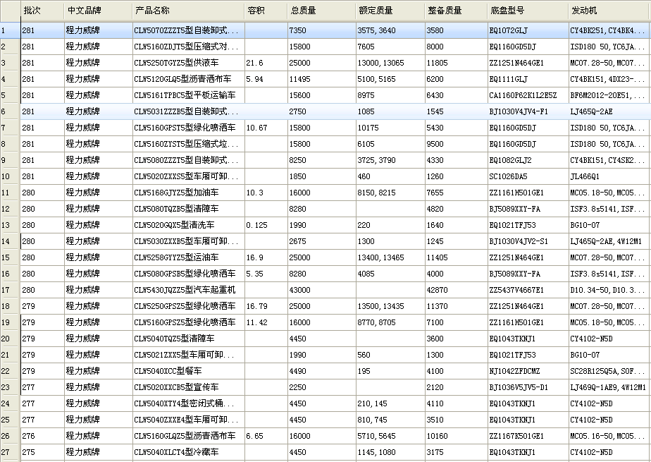 2016年是實(shí)現(xiàn)“十三五”規(guī)劃開(kāi)局之年,又適逢環(huán)保部實(shí)施國(guó)五排放升級(jí),為適應(yīng)市場(chǎng)需要,程力公司在282批新上公告56個(gè),283批又跟進(jìn)了56個(gè)公告,2批公告總量達(dá)到112個(gè),其中國(guó)五車(chē)型102個(gè),新能源車(chē)型9個(gè)。車(chē)型覆蓋綠化噴灑車(chē)、壓縮式垃圾車(chē)、高空作業(yè)車(chē)、吸糞車(chē)、車(chē)廂可卸式垃圾車(chē)、自裝卸式垃圾車(chē)、掃路車(chē)、吸污車(chē)、壓縮式對(duì)接垃圾車(chē)、清洗吸污車(chē)、洗掃車(chē)、清洗車(chē)、運(yùn)油車(chē)、鋁合金運(yùn)油車(chē)、腐蝕性物品罐式運(yùn)輸車(chē)、鮮奶運(yùn)輸車(chē)、粉粒物料運(yùn)輸車(chē)、供液車(chē)、冷藏車(chē)、散裝飼料運(yùn)輸車(chē)、清障車(chē)、舞臺(tái)車(chē)、售貨車(chē)、同步碎石封層車(chē)、平板運(yùn)輸車(chē)、純電動(dòng)車(chē)輛等,可謂是新品大盤(pán)點(diǎn)。以上車(chē)型中,不僅有傳統(tǒng)車(chē)型,也不泛為適應(yīng)市場(chǎng)新形勢(shì)而開(kāi)發(fā)的智能型車(chē)。 下面是湖北程力國(guó)五車(chē)輛一些公告