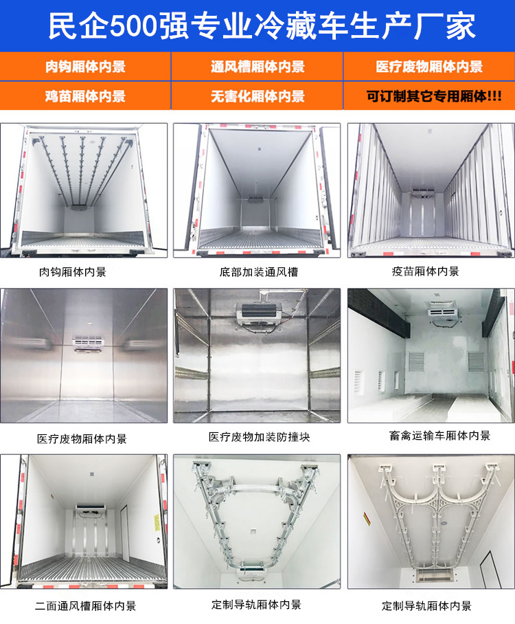 箱體采用三明治結構,內外采用冷藏車專用玻璃鋼(可反射陽光可選用不銹鋼),中間保溫層采用聚氨酯發泡隔熱材料,18米罐注一次成型,產品重量輕,漏熱率(導熱系數)低,強度高,保溫效果好,廂體美觀大方扎實耐用。廂體厚度8CM.廂體全為不銹鋼鎖件,鋁合金包角,廂體可選裝通風槽、開側門等。根據需要可選裝配國內外知名制冷機組(溫度達到保鮮或冷凍要求),可根據您的需求進行定制生產。